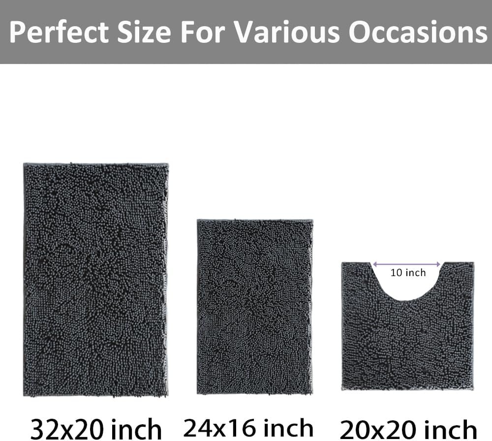 - 【Perfect 3 Pieces Chenille Bathroom Rugs】Our bathroom rug set include 1 Small Bath Rug 16″x24″, 1 U-Shape bath mat 20″x20″, 1 Large Bathroom mat20″x32″. The three different size perfect fit your hotel, sauna, shower, gym for bathroom, bedroom, dining room, living room, and so on. allows you to step on the soft carpet in the bathroom without touching the cold ground.suitable for indoors/outdoors.