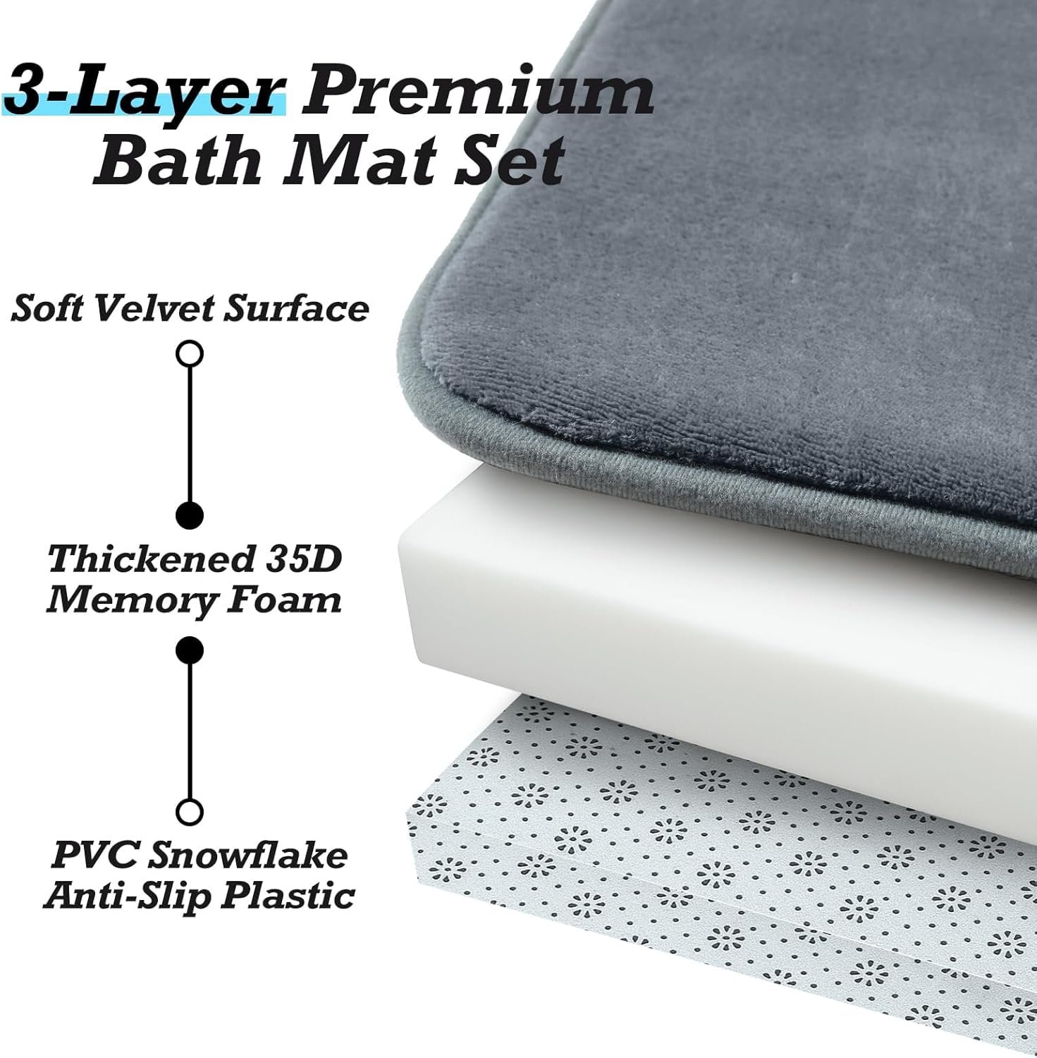 HUXMEYSON Bathroom Rugs Sets 3 Piece, Non-Slip & Quick Dry Bath Mat Set, Ultra Soft Velvet Bath Rugs for Bathroom, Toilet and Shower Floor, Grey