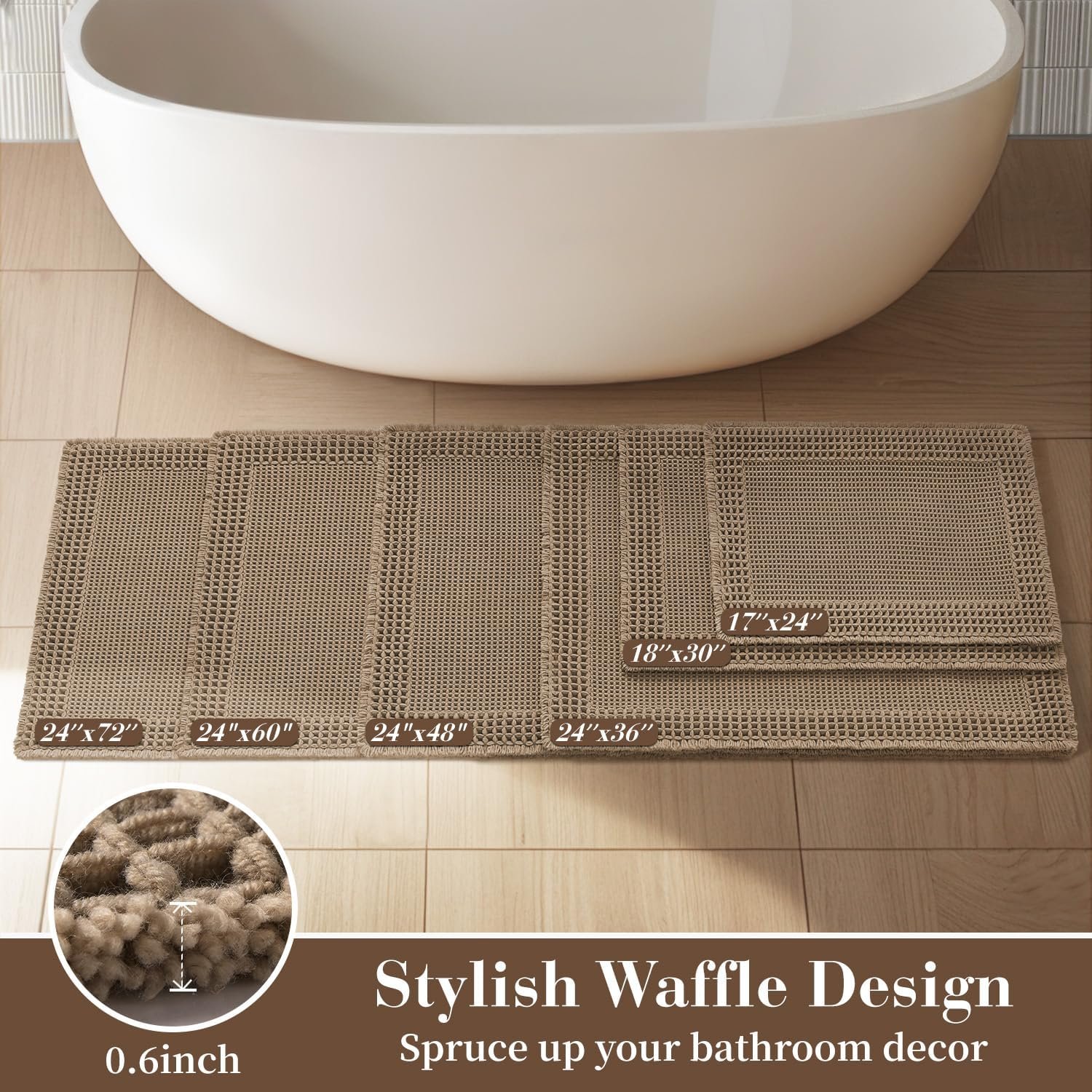 - WAFFLE DESIGN WITH TASSELS: Distinctive textured appearance adds a touch of stylish and texture to the bathroom decor. The waffle bath rugs can complement various bathroom styles, such as boho and farmhouse style.