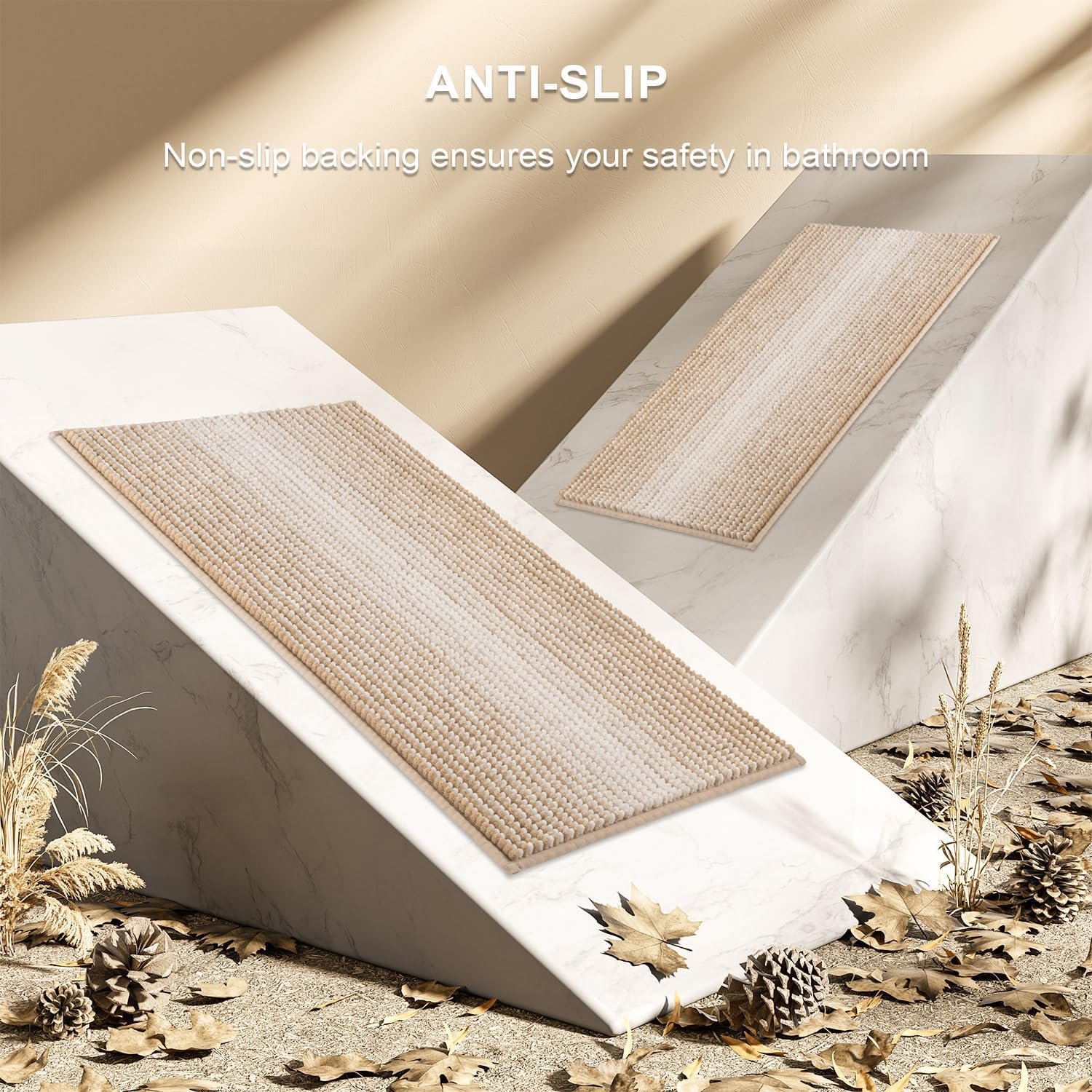 BSICPRO Bathroom Rugs and Mats Sets, 2 Piece Thick Absorbent Chenille Bath Mat Rug Set Non Slip, Soft Shaggy Bath Floor Mats for Bathroom, Machine Washable (20" x 47" Plus 16" x 24", Beige)