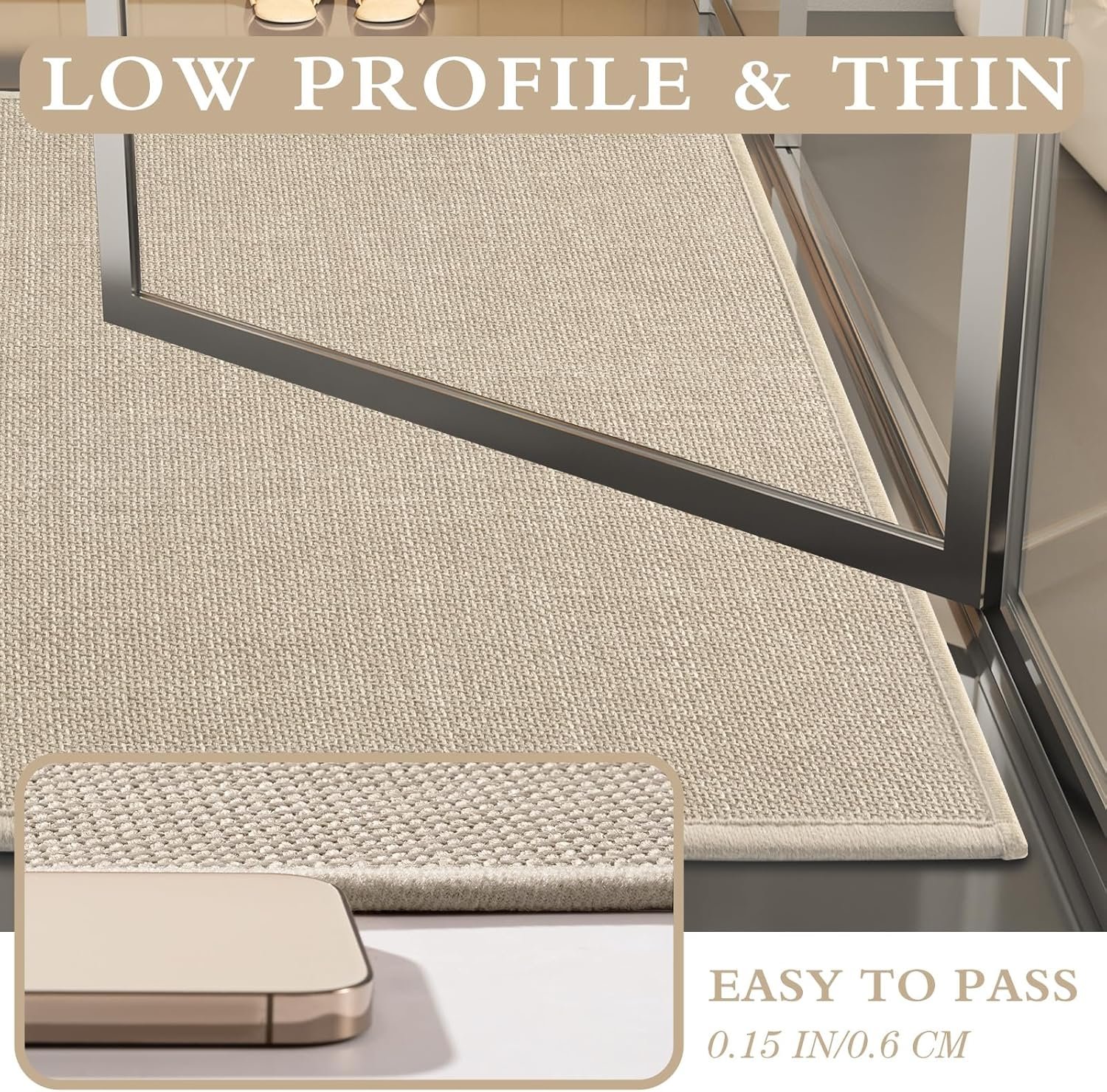 - 【Thin Bath Mat Set】This beige boho bathroom rugs is designed with a suede fabric surface that is skin-friendly to the touch, enabling you to feel comfortable on the thin bathroom mat. The low profile design won’t block doors and minimises tripping hazards