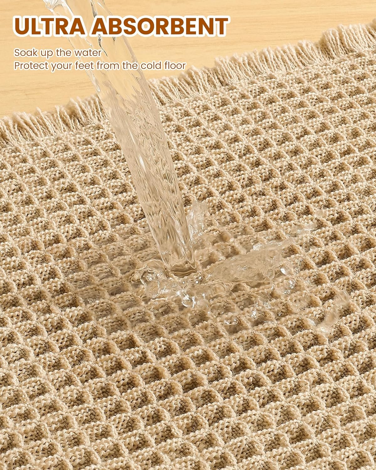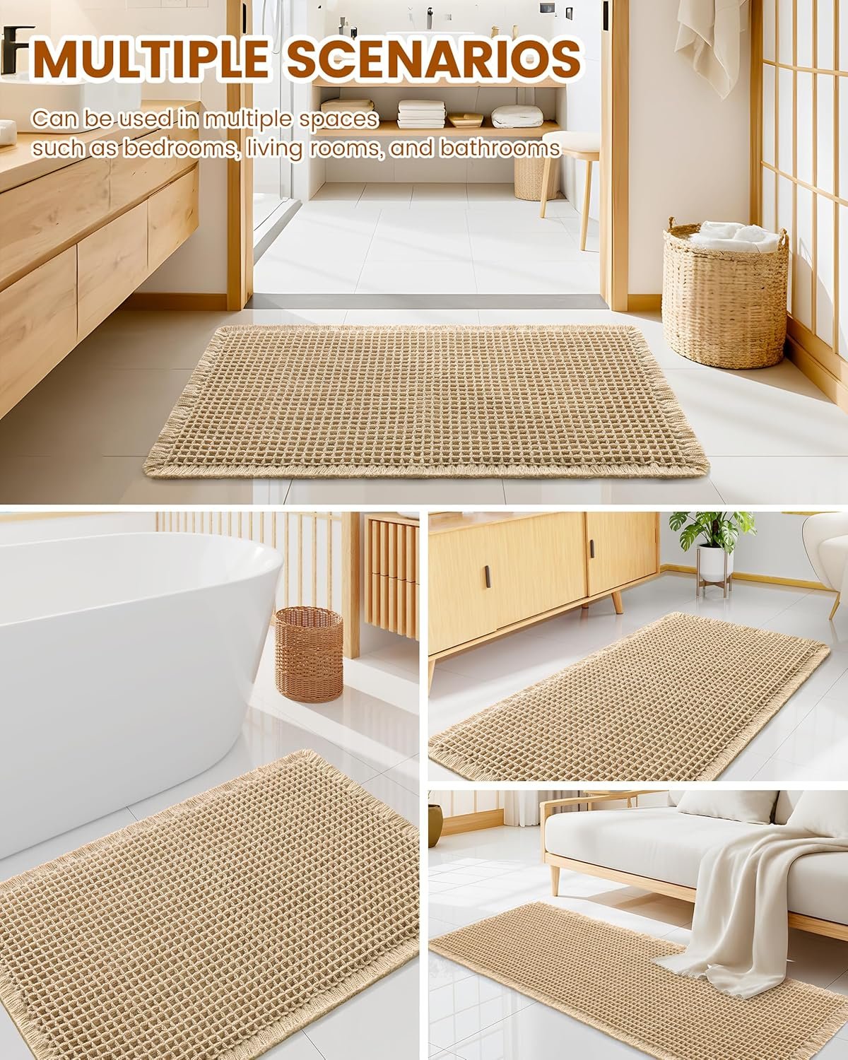 - [Soft & Comfortable]:The moment you step on the bathroom rugs, the solid thickness of the high-weight material is instantly felt—no flimsy lightness, only steady and comfortable support. The three-dimensional waffle texture fits naturally with every movement of your feet, gently wrapping every inch of your soles, making every step both stable and utterly cozy.